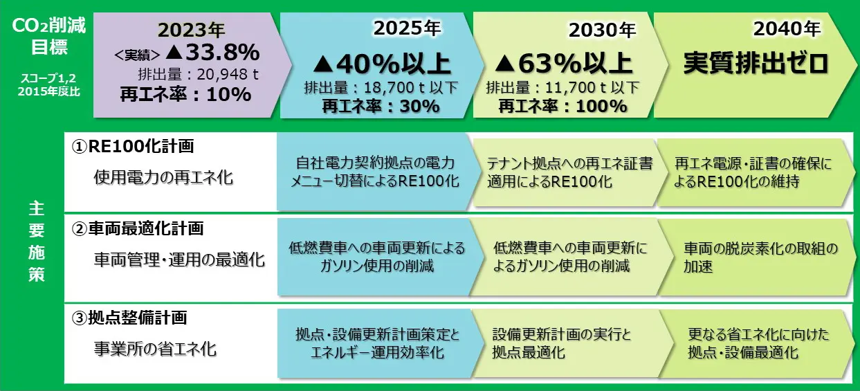 脱炭素目標の達成に向け実効性を高めた取り組みを計画的に進めていくため、脱炭素ロードマップV1.0を策定しました。具体的には ① 事業所使用電力の再エネ化 ② 車両管理・運用の最適化 ③ 拠点の省エネ化の3つの主要施策による社内実践を進めます。