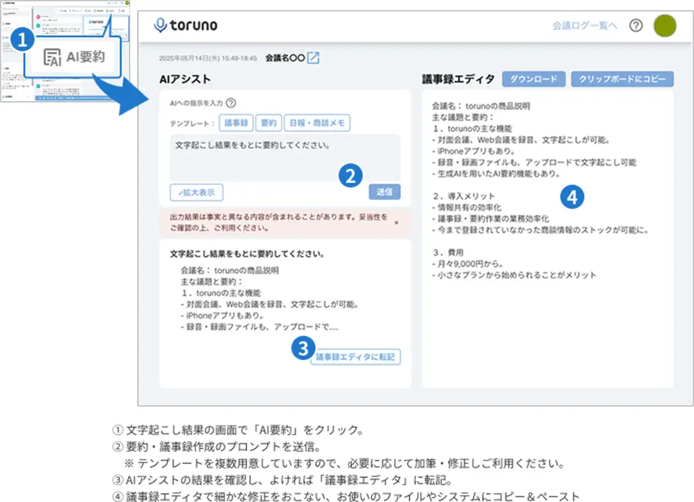 「toruno ビジネス AI要約プラン」は、会議後の業務効率化やナレッジ共有の強力な支援ツールとして、企業の生産性向上に貢献します。