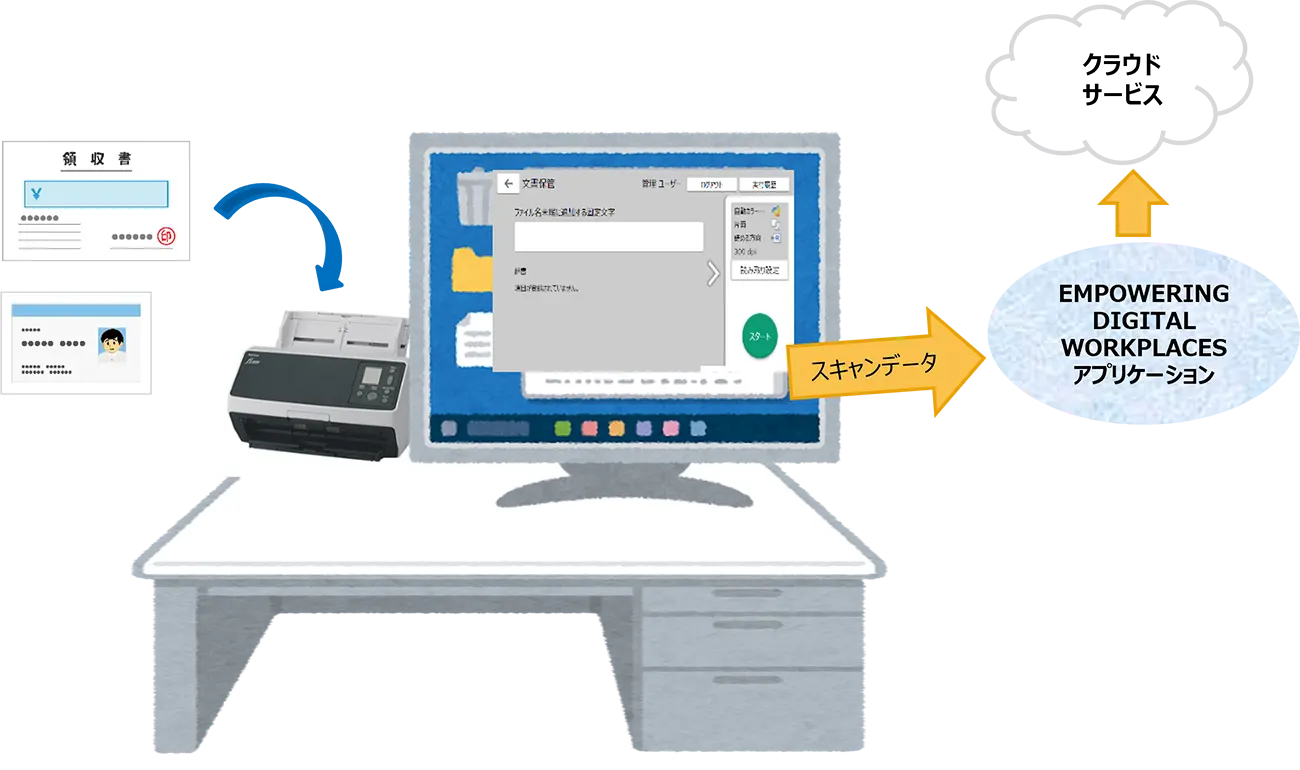 例えば「RICOH カンタンストレージ活用シリーズ」と連携すると、ストレージのフォルダを指定するだけで、スキャンデータに任意のファイル名を付けてテキスト付PDFで保存することができます。経理業務などスキャン利用が多い業務で、席を立たずに「RICOH fi Series」を使用して効率的に紙帳票の電子化を行い、電子化後はEDWアプリケーションを利用し帳票の後処理までスムーズに行えます。