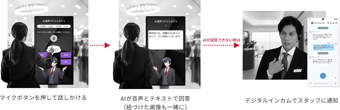 「RICOH Digital Signage AI音声コンシェルジュ」は、デジタルサイネージを介し、AIがユーザーの質問に回答するサービスです。デジタルサイネージに表示されたAIアバターに質問をすると、AIが事前に登録してある回答リストから質問に対する回答を抽出し、音声とテキストでユーザーに回答します。さらに、ボイット株式会社の「VOYT CONNECT」との連携*により、回答の登録がない質問を受けた場合には、質問がデジタルインカム経由でスタッフにエスカレーションされます。