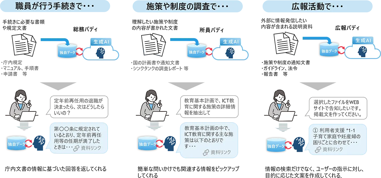 多くの自治体では、電話やメールでの問い合わせ対応に加えて、申請書・規定文書といった膨大なデータから必要な情報を探し出すのに時間がかかっています。特に地方では、十分な人材を確保するのが難しいなか、職員一人ひとりの負担が大きくなっており、業務の効率化が求められています。