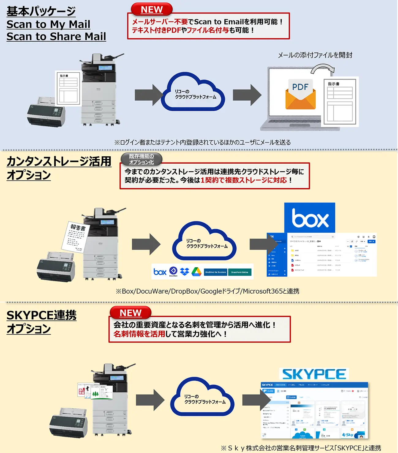 有償オプションの第一弾としては、複合機やスキャナーからお客様が契約しているクラウドストレージへ直接スキャンデータを保存でき、かつPCレスでクラウドストレージ内のデータを印刷できる「カンタンストレージ活用オプション」を提供開始します。これまで提供してきた「RICOH カンタンストレージ活用シリーズ」はクラウドストレージごとに契約が必要でしたが、一つの契約で複数のストレージサービスとの連携が可能になります。また、Sky株式会社の営業名刺管理サービス「SKYPCE」と連携する「SKYPCE連携オプション」もあわせて提供開始します。複合機やスキャナーで名刺を一括スキャンし、SKYPCEに直接登録することができます。SKYPCEに登録された名刺は企業データベースと連携され、顧客情報の共有・活用による営業効率の向上に貢献します。