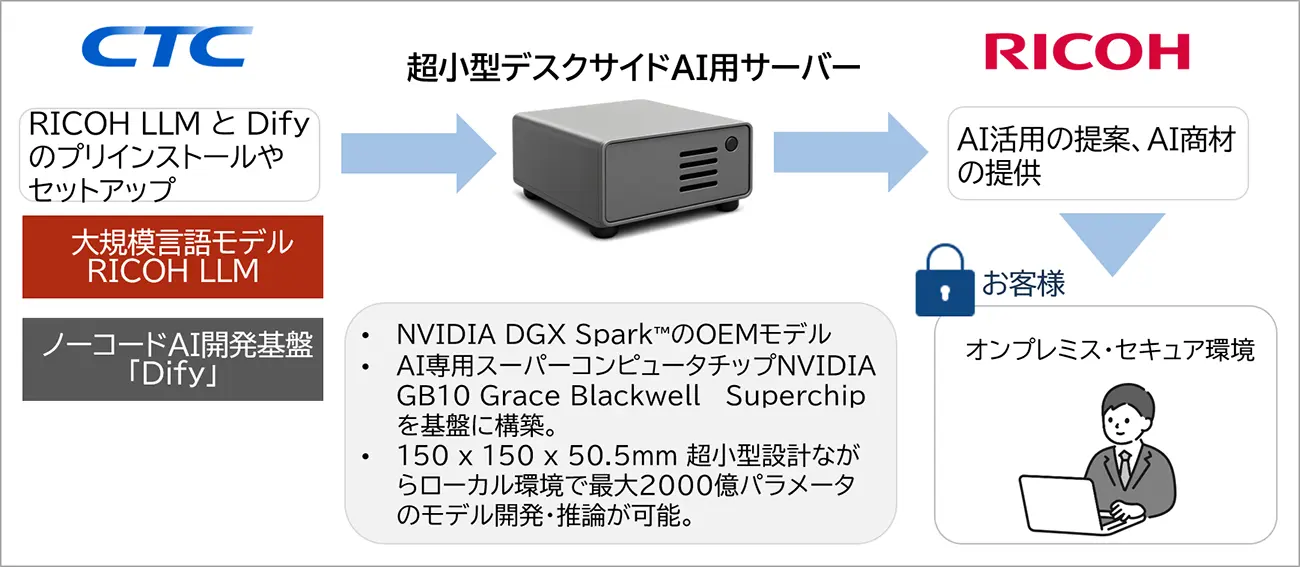 伊藤忠テクノソリューションズ株式会社(代表取締役社長:新宮 達史、以下CTC)と、株式会社リコー(社長執行役員:大山 晃)は、お客様の業務におけるAI活用の支援を目的として、小型のデスクサイドAI用サーバーとリコー製LLM(大規模言語モデル)を組み合わせ、オンプレミス環境でセキュアかつ手軽に生成AIを利用できるソリューションを共同開発しました。本ソリューションは、設置場所を問わずAI環境を構築でき、モデル検証から業務単位での活用までを支援します。本日よりリコージャパン株式会社(社長執行役員:笠井 徹)を通じて提供開始します。