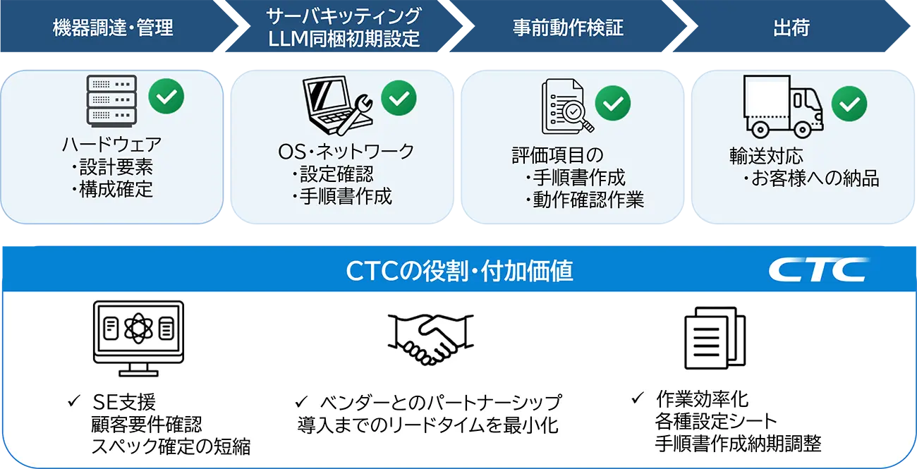 CTCは、長年のSI実績とインフラ構築で培ったノウハウを基に、本ソリューションの導入プロセス最適化を支援します。また、ベンダーとのパートナーシップを活かし、導入までのリードタイムを最小化します。さらに、各種設定シートや手順書の整備、出荷前の動作検証、出荷・輸送管理までを一括して対応することで、現場作業の負荷を大幅に軽減します。