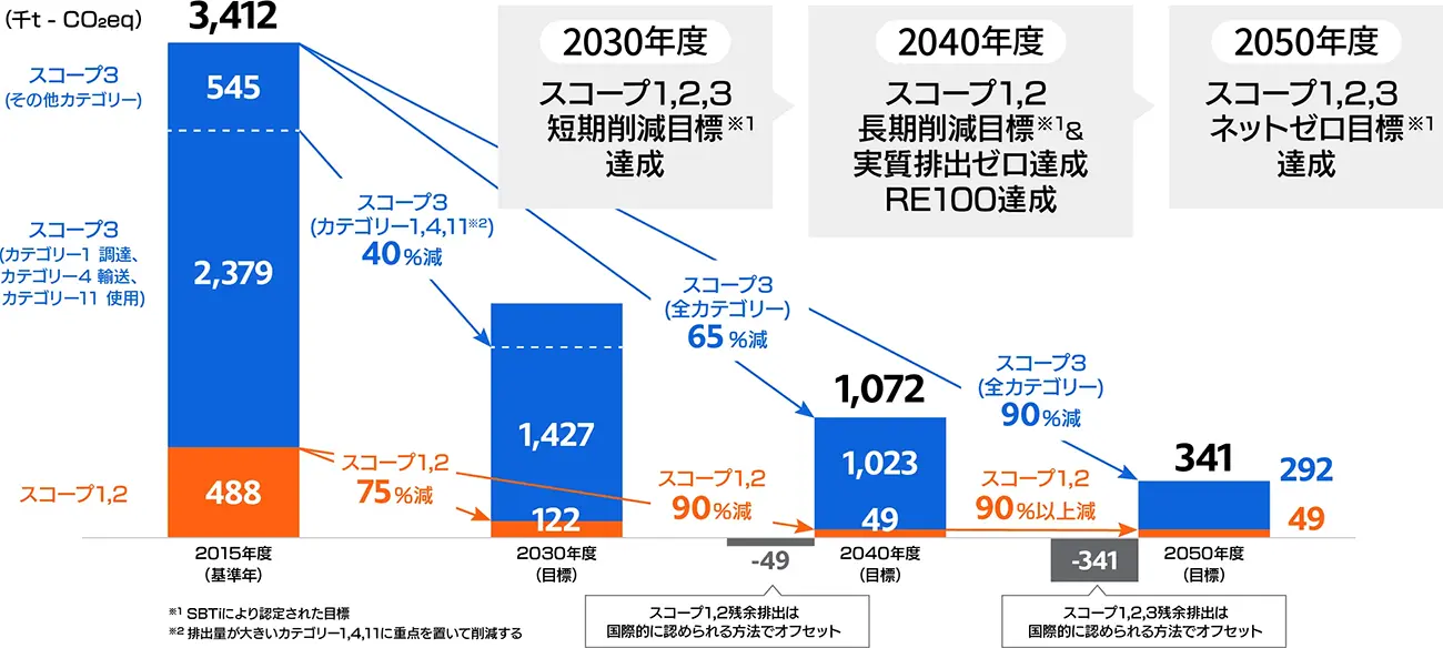 | 2050年度 | 90%以上削減 | 90%削減*2 (全カテゴリー) |