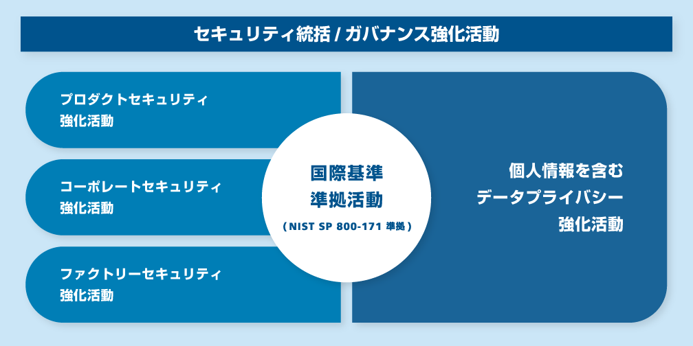 サイバー攻撃の増加と高度化に伴い、その標的は業種を問わず、無差別かつあらゆる産業に拡大しています。リコーグループでは、お客様の情報資産を守ることを第一に配慮したセキュリティ活動を行い、国際的な基準・ガイドラインである、NIST SP 800-171への準拠を目指します。この活動は「コーポレート」「プロダクト」「ファクトリー」「データプライバシー」を包括したセキュリティ強化の一環です。