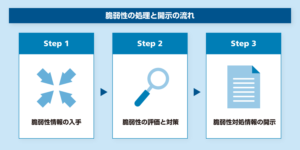 開発部門は、脆弱性を評価した上で、製品・サービスに影響する脆弱性であることを確認した場合は、対策を実施し、お客様の製品・サービスへの対策手順を準備します。