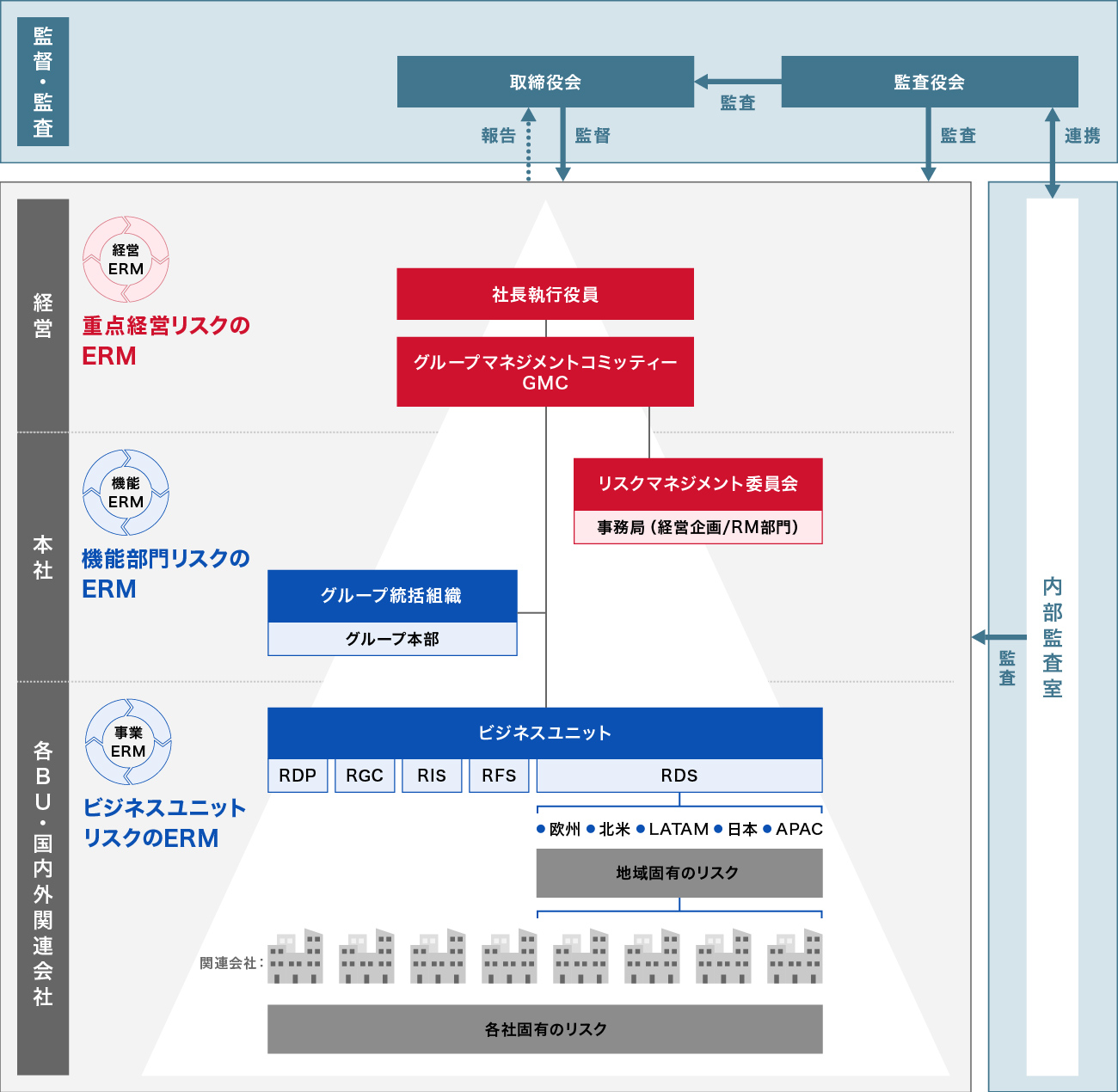 当社では、リスクマネジメント原則を含む「経営管理基本原則」と「リスクマネジメント基本規程」を定め、内容の周知徹底を図っています。リスクマネジメント原則に基づき、GMC・リスクマネジメント委員会および各組織の推進責任者・推進者がリコーグループの事業に影響を与えるリスクについて、ERM(Enterprise Risk Management)の考え方をベースに機会/脅威の両側面からリスク管理を行っています。