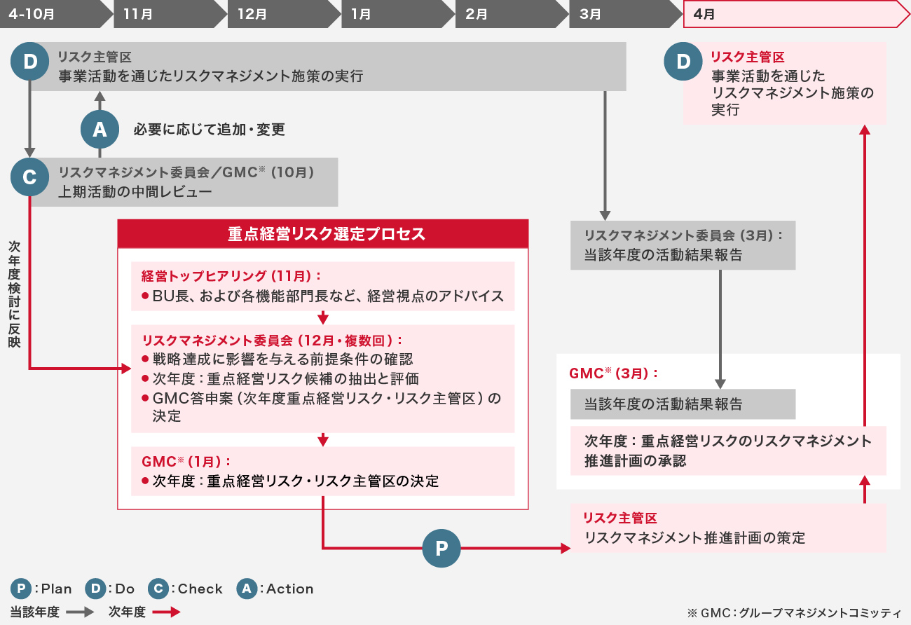 GMCとリスクマネジメント委員会は、経営理念や事業目的などに照らし、経営に大きな影響を及ぼすリスクに対してストレステスト等を通じて、網羅的に識別した上で、重点経営リスクを決定しています。また、その対応活動に積極的に関与しています。