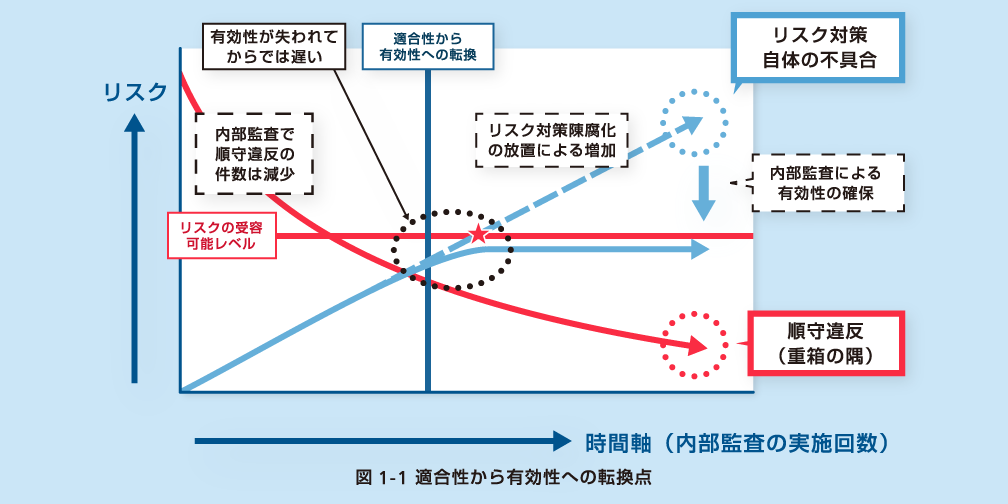 リスクの受容レベルを一定とすると、監査で発見される順守違反は時間とともに減少し、適合性に関するリスクは受容可能レベルを越えなくなります。しかし、その指摘は重箱の隅レベルになります。