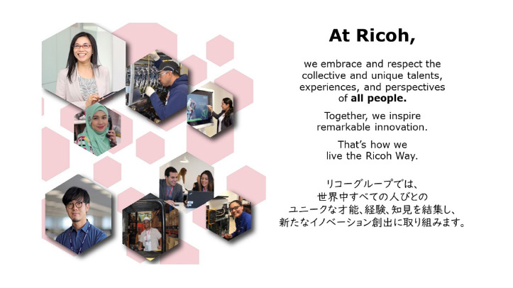 これは、リコーグループが今後、あらゆる多様性や価値観を互いに受け入れ、グローバルの社員が一つのチームとして働く決意を表すものとして制定し、22言語でグローバル各極に発信しています。