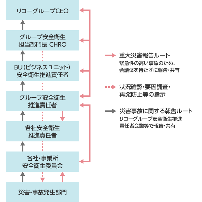 リコーグループでは、グループ全体の安全衛生活動を統括する担当部門長(CHRO)の下、BU(ビジネスユニット)※、各社の安全衛生推進責任者で組織される安全衛生推進責任者会議を開催しています。毎年開催されるこの会議では、グループ全体の安全衛生方針の決定や推進施策の進捗確認などを行っています。また、各拠点やグループ会社の活動計画や活動状況の内部監査を定期的に実施し、改善やグループ内への水平展開に取り組んでいます。