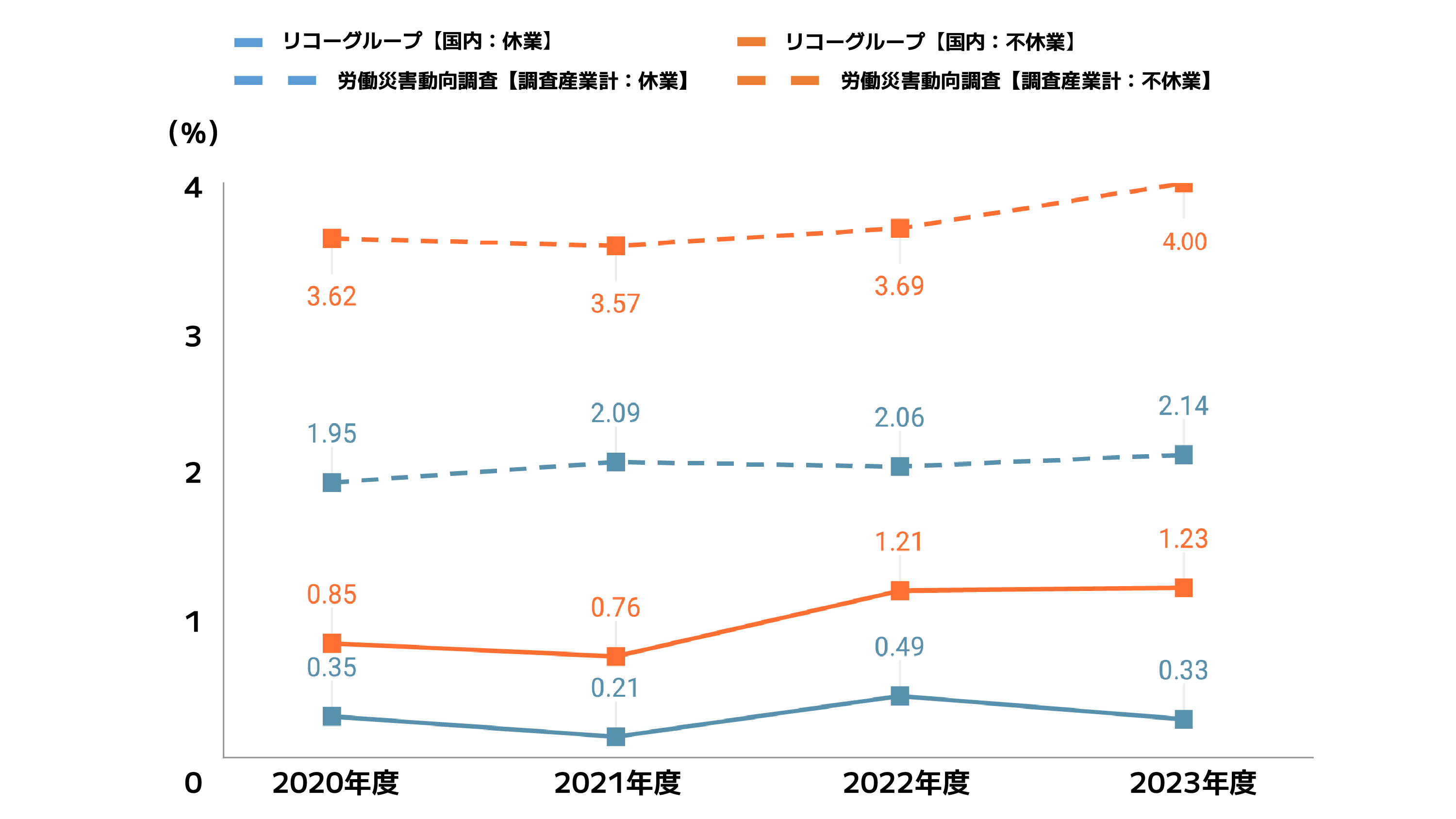 2024年度は労働災害発生の低減に向けた施策推進の結果、「重大災害(※1)0件」は継続、休業災害度数率は0.39、不休業災害度数率は1.30となりました。