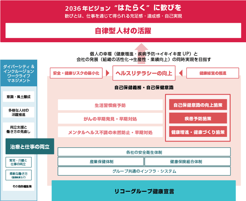 2036年ビジョンを見据え、リコーグループ健康宣言に基づき、中期経営計画を策定し、健康支援活動を推進しています。
