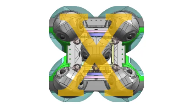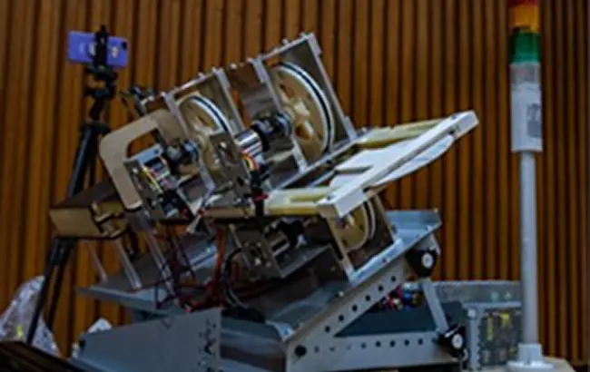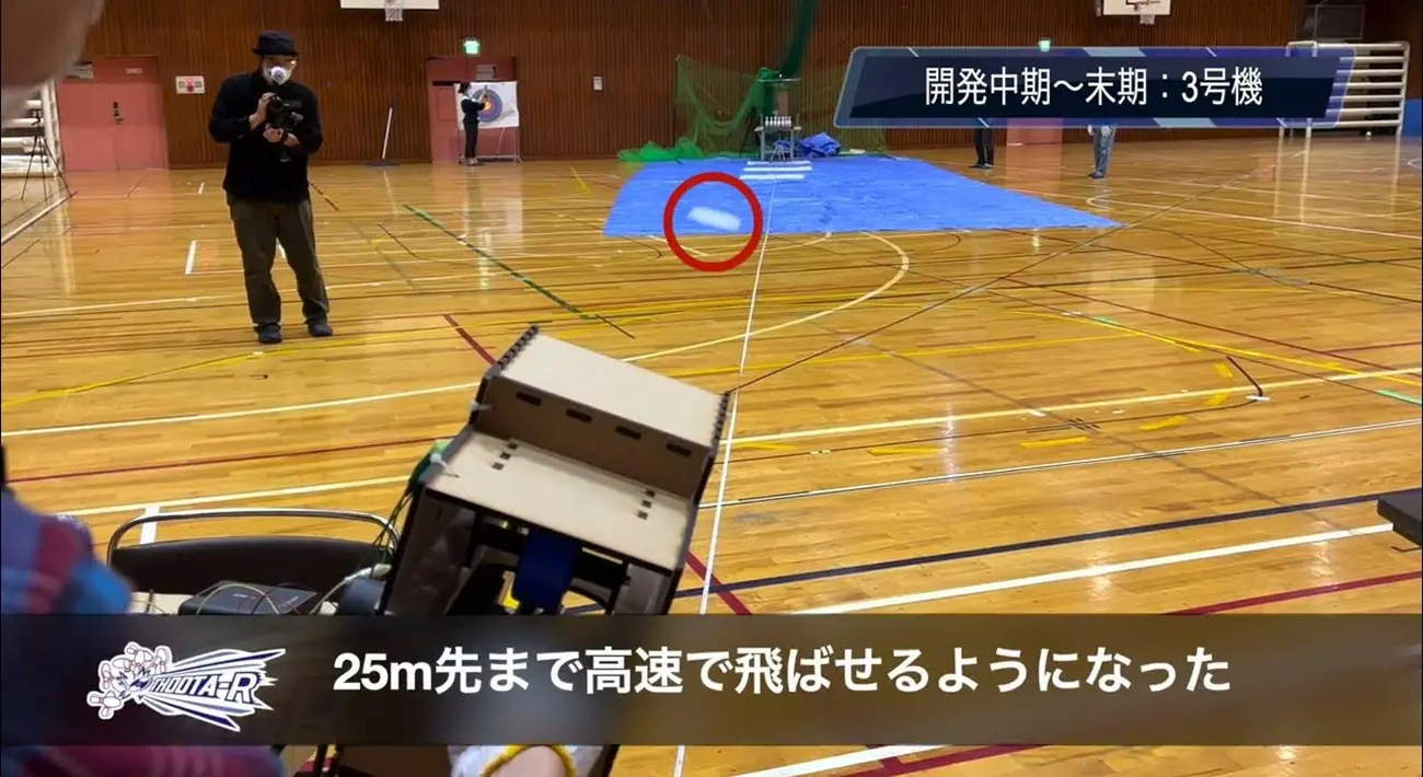 回転する縄に収まるコンパクトな形状でも安定した高いジャンプ力を備えるため、回転運動を直線運動に変えるシンプルな機構を採用。両側のアームを逆方向に回転させることで、バランスを取って真上にジャンプする。 リンクをアーチ状にし、1/3回転分(120deg)を不感帯とすることで、ジャンプに必要な時間を削減、高速ジャンプを可能にしている。同じパラメータなのにディスクの軌道が異なっている場合、ディスクと加速ローラー間で想定外の異常が起きている場合がある。普通に見てもわからないが、高速度カメラで1/4000秒毎に撮影すると違いがはっきりわかる。解析を通じて加圧ローラーやレールなどの機構にフィードバックし、精度を向上させた。