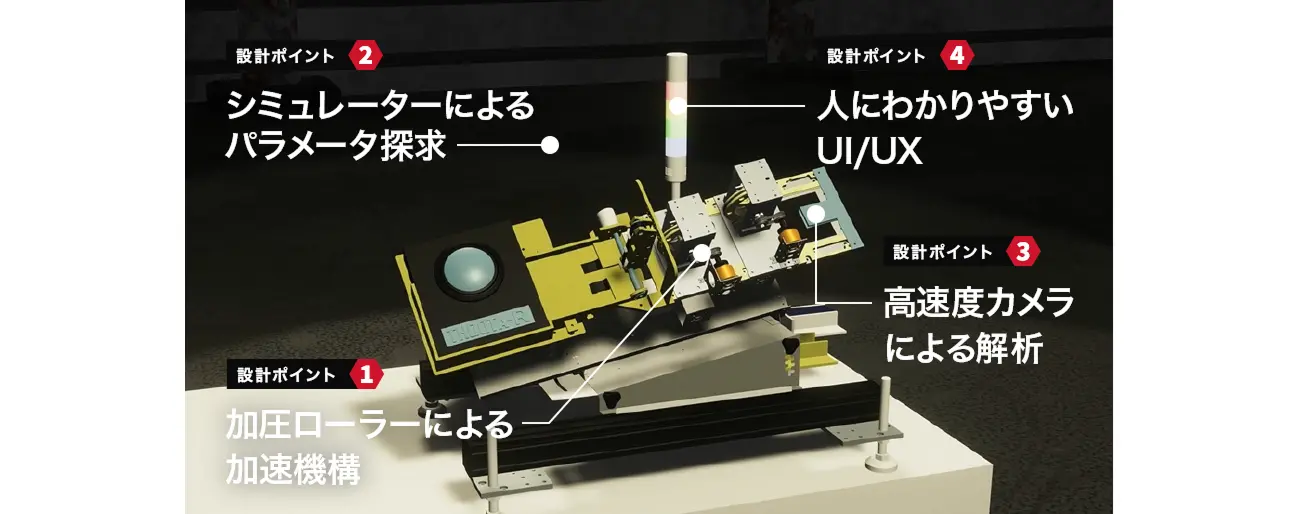 ローラーの回転数を容易に調整できるようにモニター付きのマイコンを使用。わかりやすいUI設計、本番でのオペレーションミス防止にも貢献した。安全性を高めるため、ディスクを射出する前に遠くからでも視認しやすいようにパトランプを搭載。パトランプは業務用複合機に使用されるものと同一。