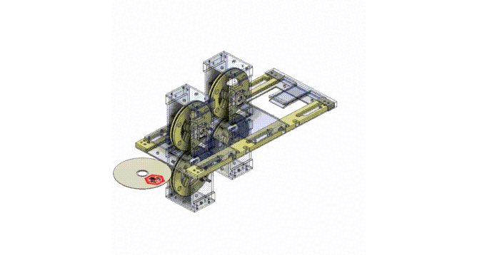 ディスク表裏の素材の違いによりローラーの回転数を上げてもDVDとローラー間でスリップしてしまい、飛距離が伸びない、また飛距離がばらつく、という課題があった。複合機の紙搬送機構を応用し、上下のローラーで挟み込み、上側のローラーをバネで圧力を加えるという機構を採用した。