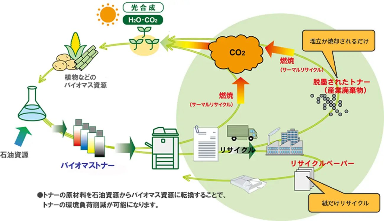 バイオマストナーは、従来のトナーに比べて石油資源の使用量を削減しており、石油資源の枯渇防止に大きく貢献することができます。また、カーボンニュートラルによって、トナーが焼却廃棄される際のCO2排出量を削減することができます。