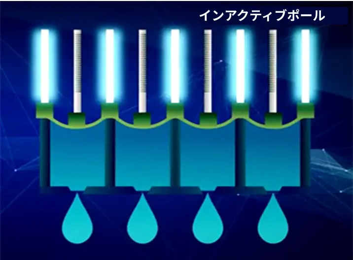 これに対し、リコーは、個別液室に圧力変動を発生させる駆動ピエゾの両端を非駆動のピエゾ(インアクティブポール)で支えることにより、隣接した個別液室間の相互干渉を防止しました。個別液室間にインアクティブポールを配置することで、各液室からのインク吐出量を、高精度かつ安定して制御できるようになったのです。