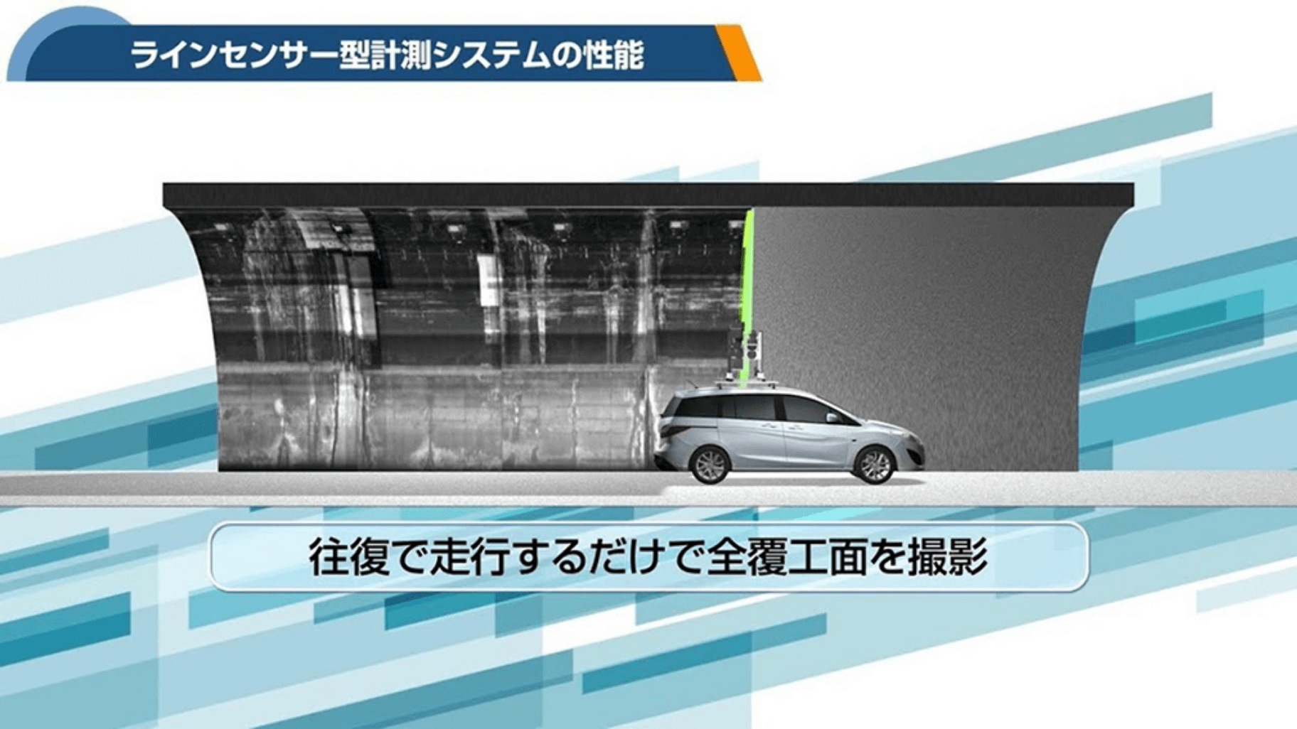 被写界深度拡大ラインセンサーカメラとライン照明を複数台用いた撮影システムで、トンネル覆工面(トンネル内壁面)を撮影します。トンネル内を走行することで走行車線側の撮影を行ない、往復で走行すると全覆工面を撮影できます。高解像度かつ高品質で撮影可能なラインセンサー型計測システムを実現しました。