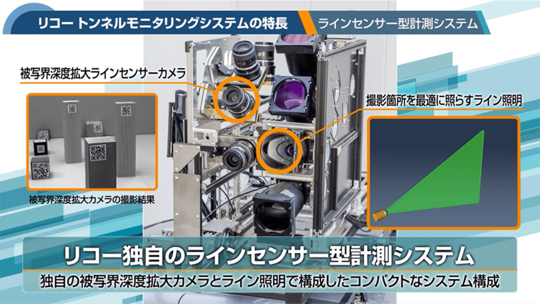 リコーは、今まで独自の光学技術やシステムで、道路舗装など幅広く社会インフラの維持管理に応用可能な技術を開発し、今回トンネルにその範囲を広げました。