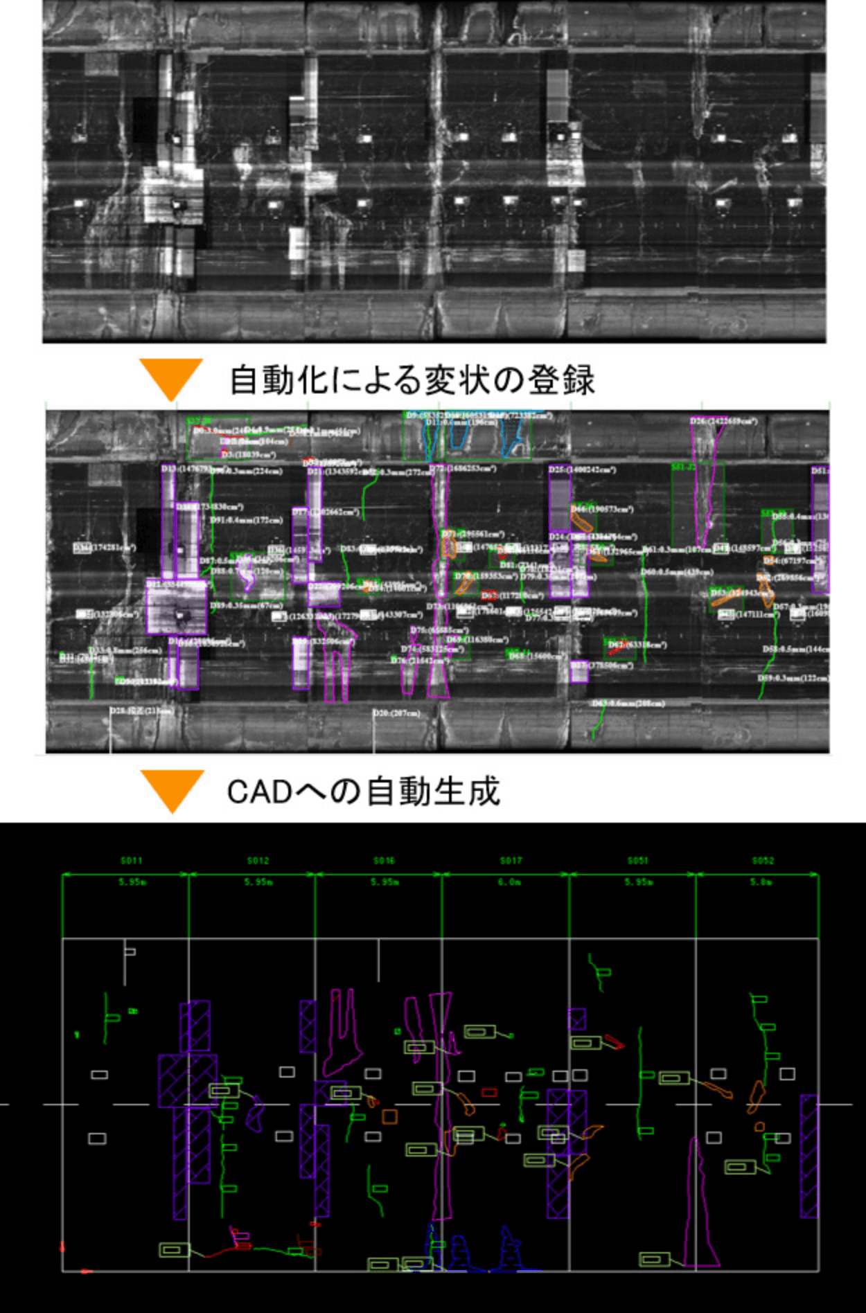 これらの技術により、交通規制をせずに走行撮影が可能となり、従来まで現場で行なわれていたトンネル覆工面のひびなどの変状部のスケッチ作業や変状部の撮影作業がなくなり、安全かつ点検工数を削減できます。