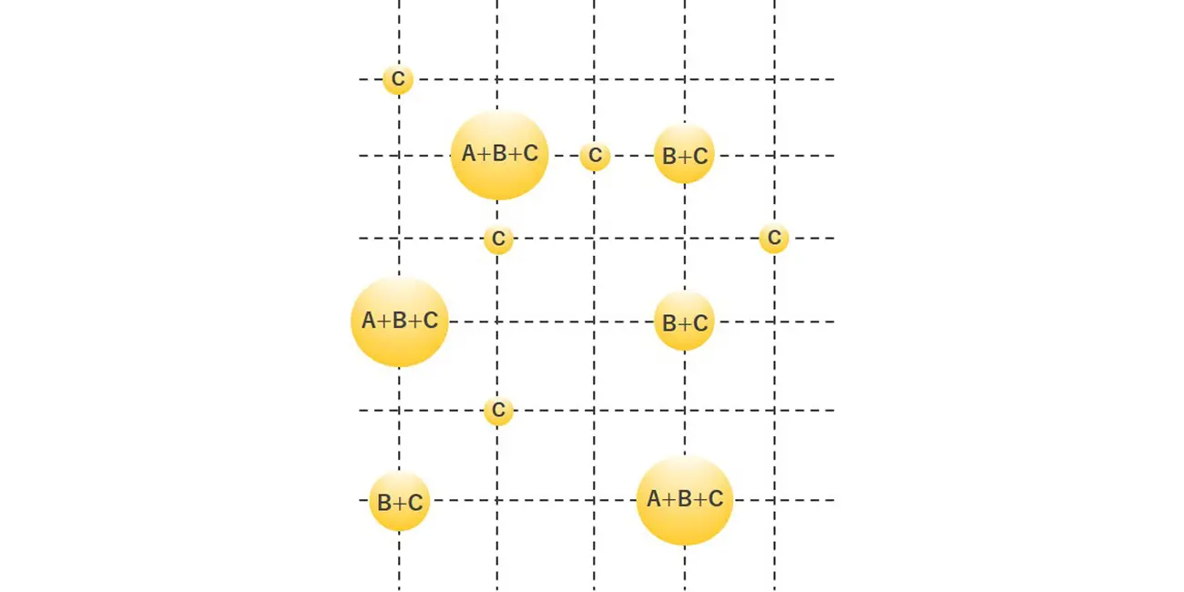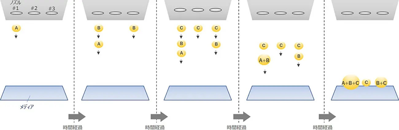 インクジェットヘッドからインク滴を高速に吐出すると同時に、各ノズルから吐出するインク滴の数を制御します。各ノズルから吐出されたインク滴は印刷メディアに到達する前に空中で統合し、印刷メディア上で小液滴から大液滴までさまざまなサイズを表現します。