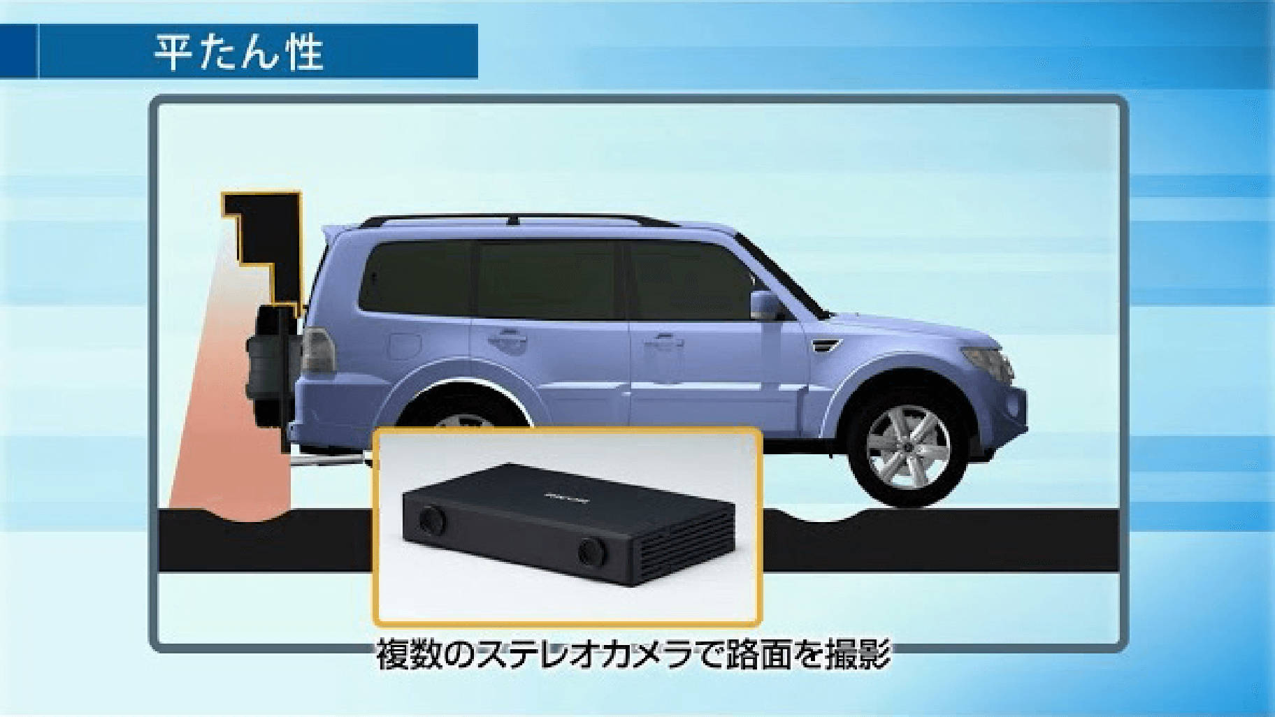 ステレオカメラを複数台用いた撮影システムで、「ひび割れ率」「わだち掘れ量」「平たん性(σ)」の3項目の計測を実現します。ステレオカメラとは、左右に並べられた2台のカメラの視差情報を利用して、前方の対象物の奥行き情報(3次元情報)が得られるカメラです。