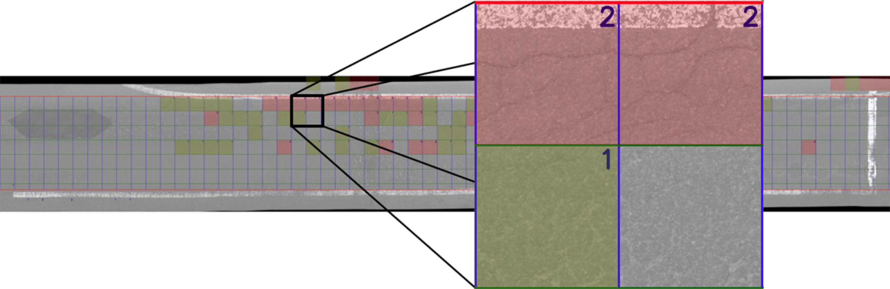 一辺50㎝のメッシュを自動生成し、ひび割れの本数をAIが自動判別