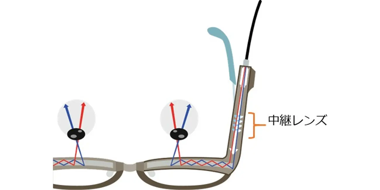 リコーは、中継レンズを用いた特殊な光学系を開発し、ディスプレイユニットをこめかみに配置することを実現しました。中継レンズに通すことで、こめかみにあるディスプレイ映像がそのまま導光板付近に再現されます。ディスプレイユニットをこめかみに配置したことで、スマートグラスの前後の重量バランスが均一となり、鼻にかかる荷重を一般のメガネと同じ程度まで減少することができました。この技術により、長時間着用し続けても快適な着け心地を実現しました。