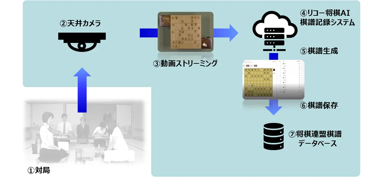 クラウド上にある「リコー将棋AI棋譜記録システム」により、動画のストリーミング映像から棋譜を生成します。(③④⑤)