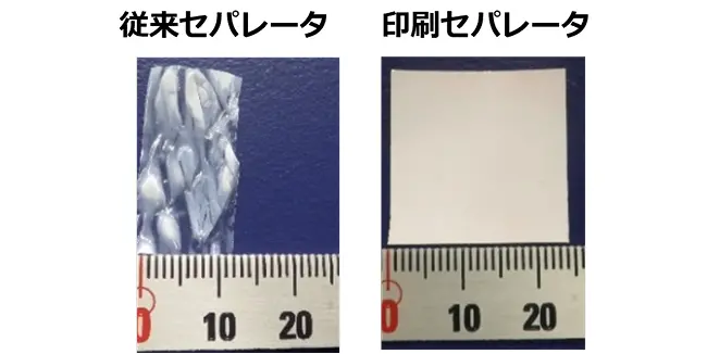 リチウムイオン電池の高容量化に伴い、電極層は厚膜化する一方で、電池容量に寄与しないセパレータ等の材料は薄膜化が求められています。リコーは電池材料向けに厚膜化に対応するヘッド、薄膜化に対応するヘッドを開発し、インクジェット技術による電池製造に活かしています。