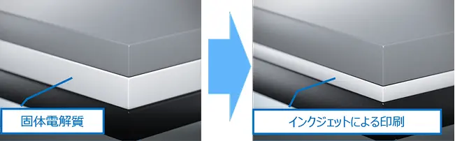 インクジェット印刷向け電池材料インクと電池材料向けのインクジェットヘッドの開発に加え、量産化に対応する装置を開発することで、自由な位置、自由な膜厚、自由な形状でのデジタル印刷が可能になりました。