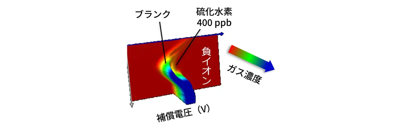 イオン化したガス・におい分子の種類を特殊な交流電界でふるい分けたあと電流として検出するField Asymmetric Ion Mobility Spectrometry(FAIMS)という技術を採用しています。FAIMSは特殊な環境下でしか使えない化学分析用の技術ですが、リコーは一般的な環境でも使えるようにFAIMSのコア部分を独自開発し、改良を行いました。ポンプで吸引した気体をリアルタイムに連続計測することで、気体の組成の変化をとらえることができます。試作機は高さ120mm、幅220mm、奥行160mmで、持ち運びとバッテリー駆動に対応します。