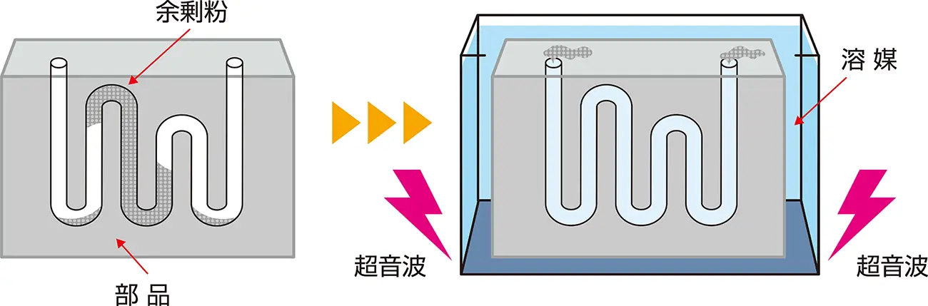 溶媒を使った余剰粉除去技術の概略図