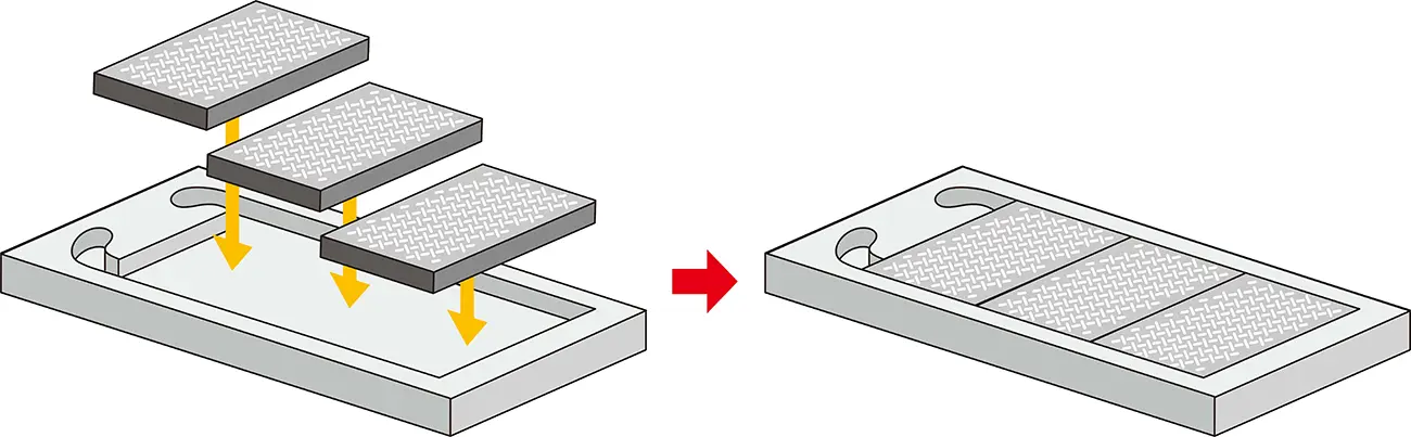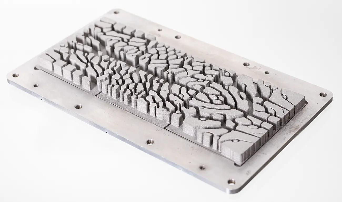 高性能な熱交換部品には複雑な流路が必要になることがありますが、造形後に流路に残った粉を完全に除去するのは難しい場合があります。リコーは、溶媒を使った粉除去技術を開発し、微細な流路でも確実に粉を除去できるようにしました。