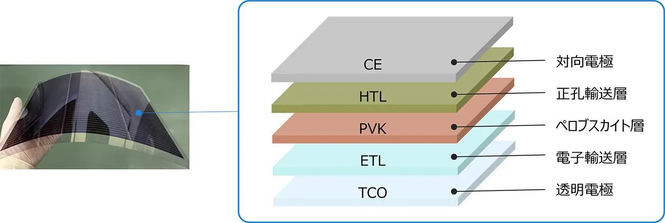 ペロブスカイト太陽電池は、透明電極上に、電子輸送層、ペロブスカイト層、正孔輸送層、対向電極の各機能層を成膜して作製されます。
