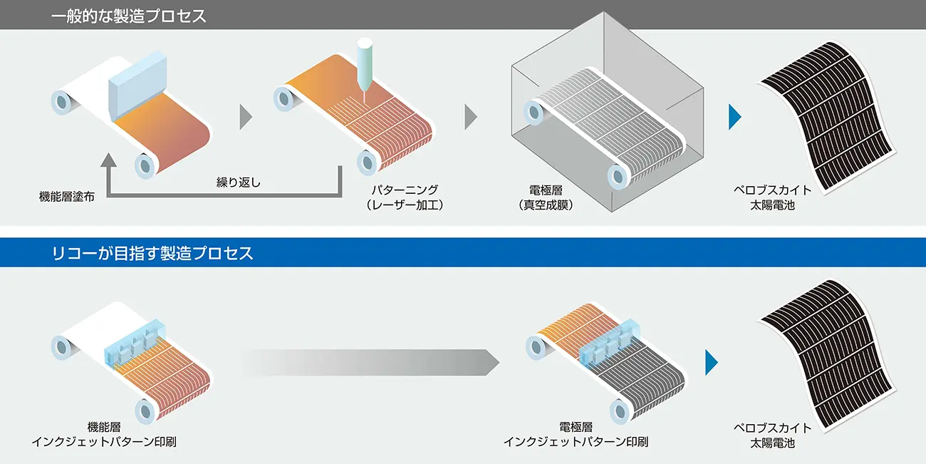 こうした課題に対し、リコーの強みの一つであるインクジェット技術を活用し、全機能層をインクジェットでパターン印刷することで、レーザー加工や真空中での成膜の工程が不要となります。さらに、商用印刷で培った搬送技術を活かし、ロール状の基材を連続的に搬送しながら高速印刷することで、高い生産性と低コスト化を実現します。